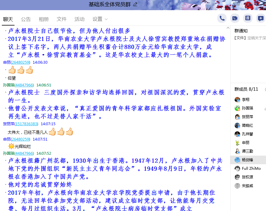 在线党日会议时,孙国瑛首先介绍了卢永根同志的生平及主要优秀事迹,播放了时代楷模卢永根同志先进事迹纪录片。大家学习了卢永根的主要事迹后,非常感动,纷纷发表感言。基础系党支部支委申丽认为,把自己的理想和祖国的需要紧密联系在一起,就是爱国的最好体现。支委简晓红同志说,卢永根捐款880万,捐赠2商铺,捐献自己的遗体,成无言良师,这里充满榜样的力量!杨剑锋老师提到布衣院士卢永根院士,在我国改革开放40年,经济建设取得辉煌成就的今天,仍然这么简朴的生活,却将毕生积蓄捐献教育事业,不忘初心,是真正的共产党员。贺丽萍、谭三勤、李翔等同志纷纷表示,向卢院士学习,搞好本职工作,与祖国同呼吸共命运。