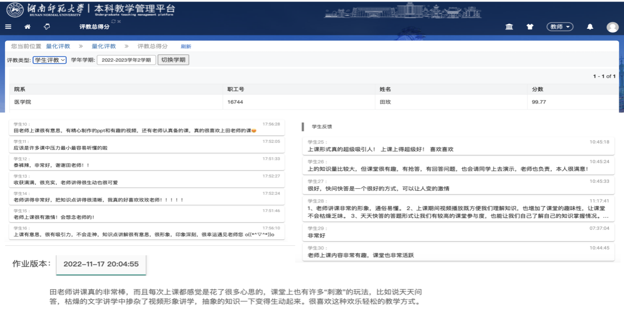 参加教学竞赛以来,田玫老师荣获10项国家级、省级等教学竞赛一等奖。从湖南省普通高校课堂教学竞赛到全国高校教师教学创新大赛,每一场比赛,田玫老师都全力以赴。在长达8个月的备赛过程中,她反复打磨参赛材料的每一个细节,从课件的美观性到案例的典型性,从互动环节的设置到课程思政的融入,她都力求精益求精。田玫老师将竞赛作为一面镜子,映照出自身的不足,也映衬出前进的方向。如今她对课堂的把控能力非常自信,学生互动积极,抬头率高,她实现了让学生快乐地学习,课程反馈好评如潮,“同学们觉得上课时间过得飞快,根本没时间玩手机”,这也是她贯彻“以赛促教,以赛育人”理念的最好证明,展现了湖南师范大学医学部教师追求卓越的专业素养。