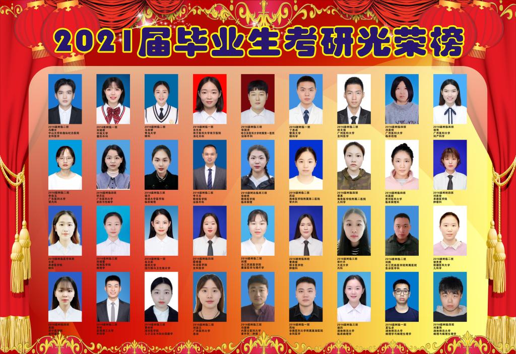 近年来,我院高度重视本科生继续深造工作,并以此作为我院提升教学质量、加强学风建设的重要抓手。通过不断强化教风、学风和班风建设,针对性开展多种活动营造考研氛围,促使我院考研成绩屡创佳绩,录取质量大幅上升。2021年,共有123人被“985”或“211”院校录取,录取学校涵盖北京协和医学院、中国医学科学院、中国科学院、复旦大学、浙江大学、中山大学、武汉大学、厦门大学、华中科技大学、吉林大学、中南大学、湖南师范大学、南方医科大学、广州医科大学、重庆医科大学等知名院校。